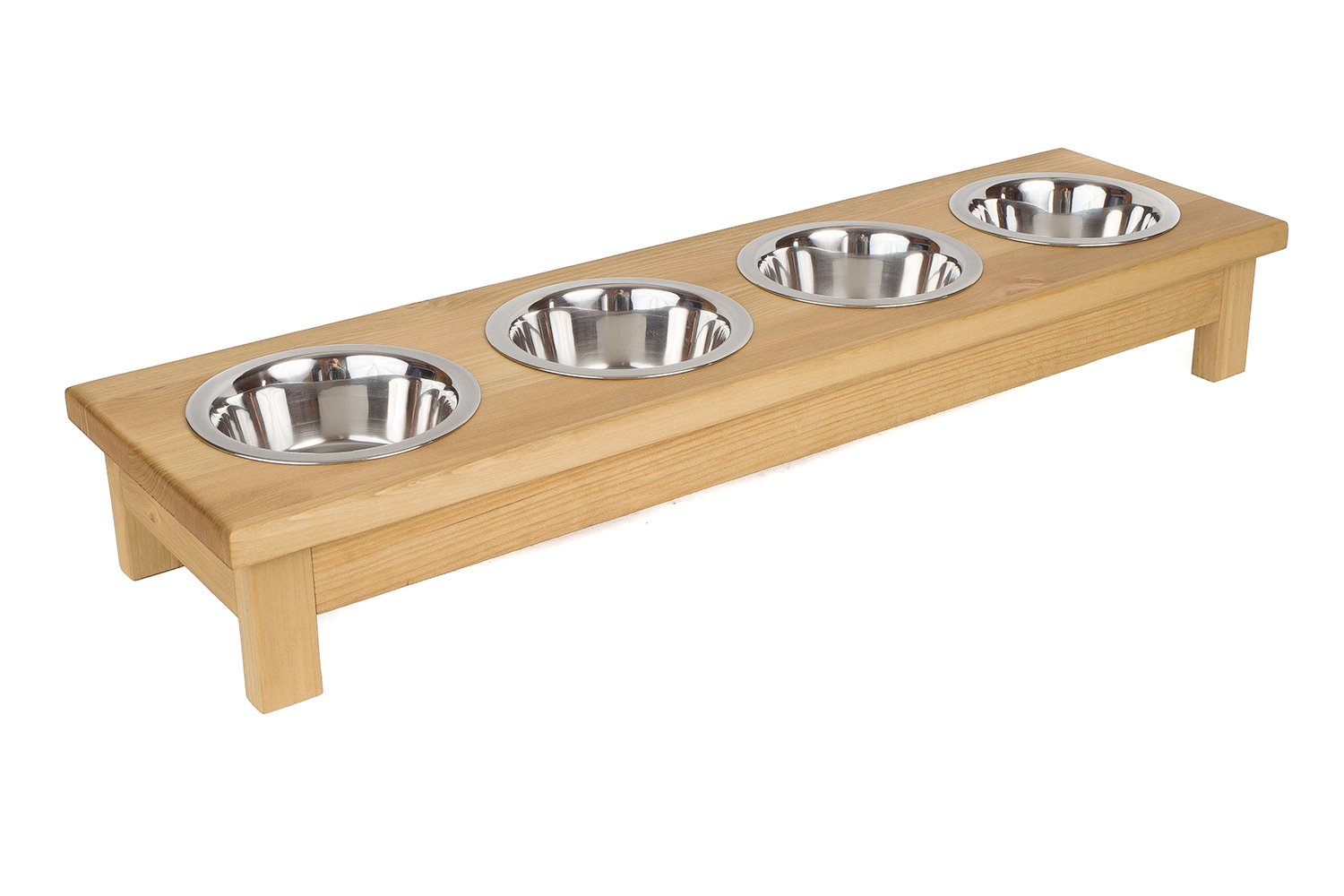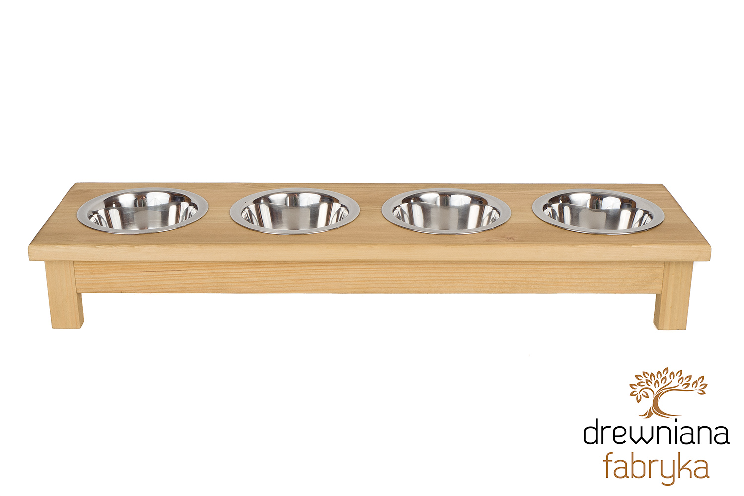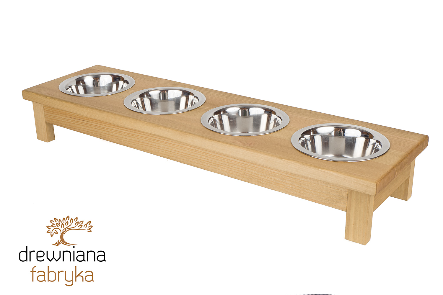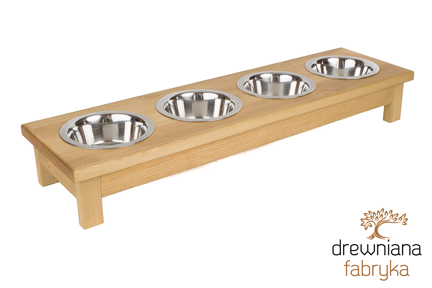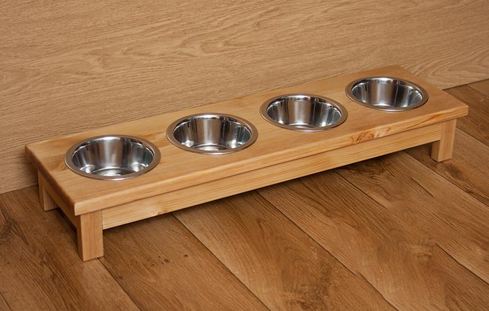 Praktyczny stojak z czterema miskami dla psa i kota. Pomaga utrzymać porządek i ułatwia karmienie kilku zwierzaków jednocześnie. Produkt ręcznie wykonany z drewna – możliwość personalizacji.