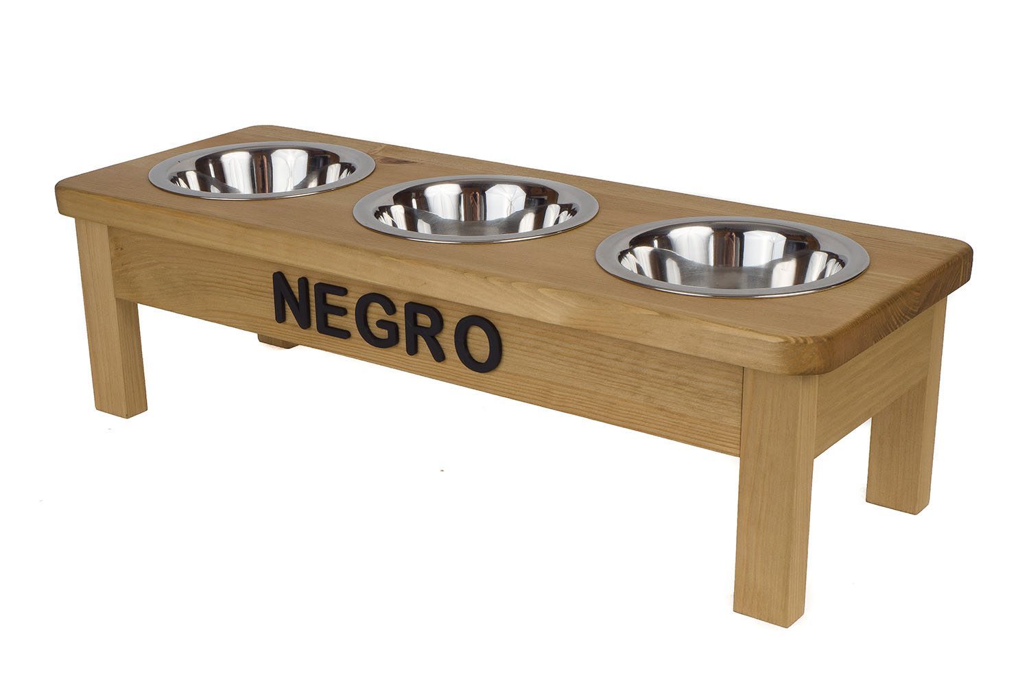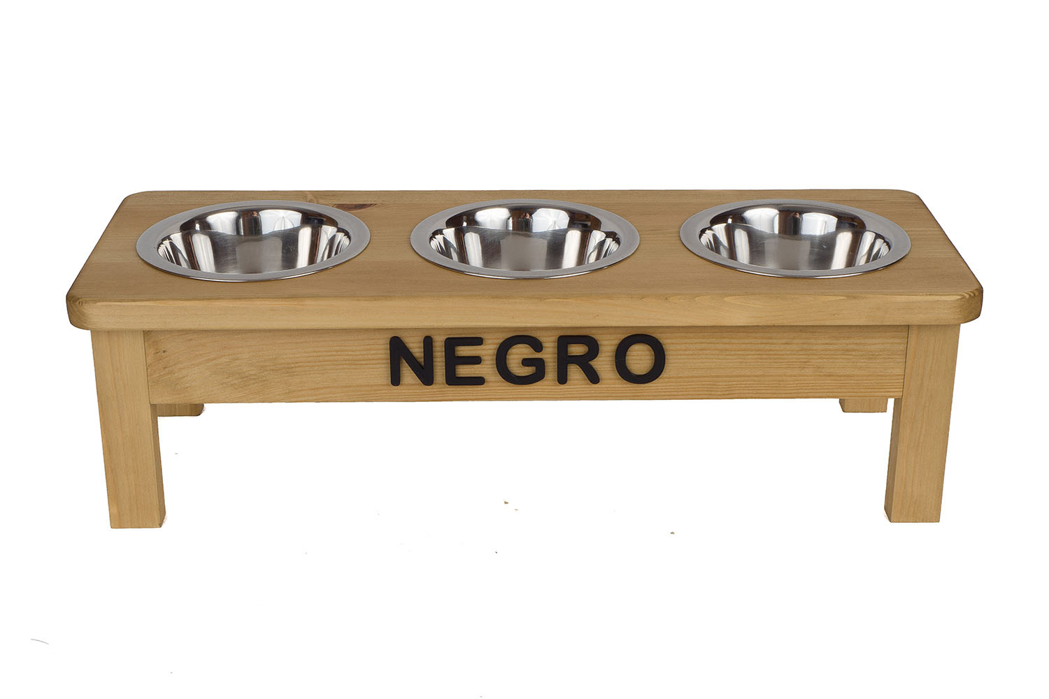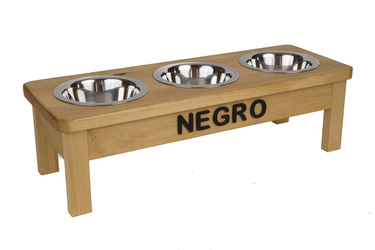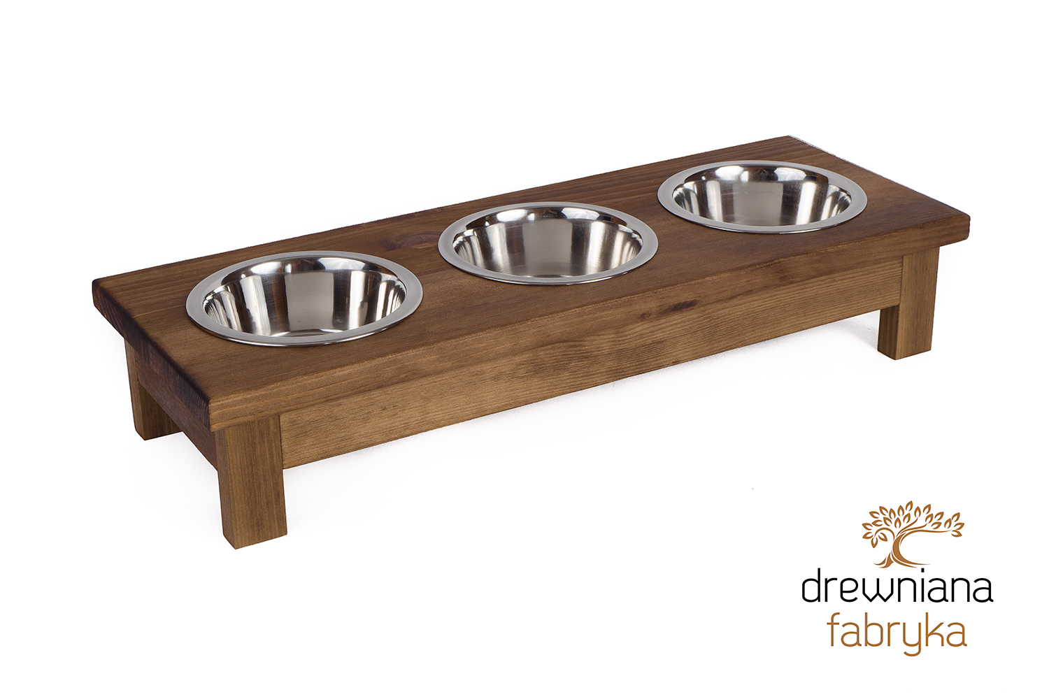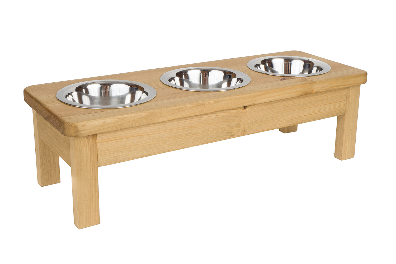Ten stojak z trzema stalowymi miskami (0,45 L) to wygodne i estetyczne rozwiązanie dla kotów i małych psów. Ręcznie wykonany w Polsce z litego drewna świerkowego, dostępny w wielu kolorach i wariantach.