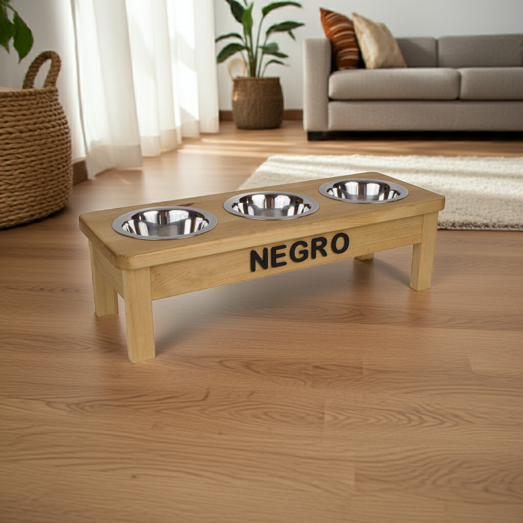 🦴 Ręcznie wykonany drewniany stojak z trzema stalowymi miskami (0,45 L). Idealny dla małych psów i kotów. Personalizacja imieniem, wiele kolorów i wysokości do wyboru. Stabilny, bezpieczny, wyjątkowy!